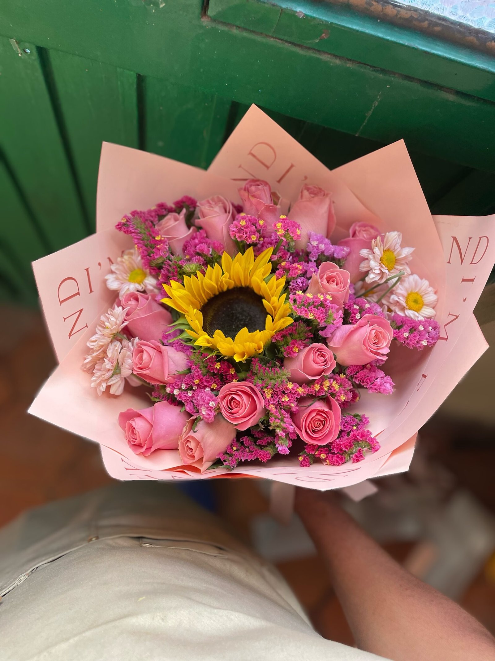 Servicio disponible en: San Miguel de Allende y alrededores.Una composición vibrante que combina la calidez de un girasol central con la suavidad de 14 rosas en tono rosita. Los detalles en statice y margaritas añaden una textura ligera y campestre, creando un equilibrio perfecto de color. El diseño se presenta en papel coreano de tonos claros con un moño artesanal que estiliza su acabado moderno.