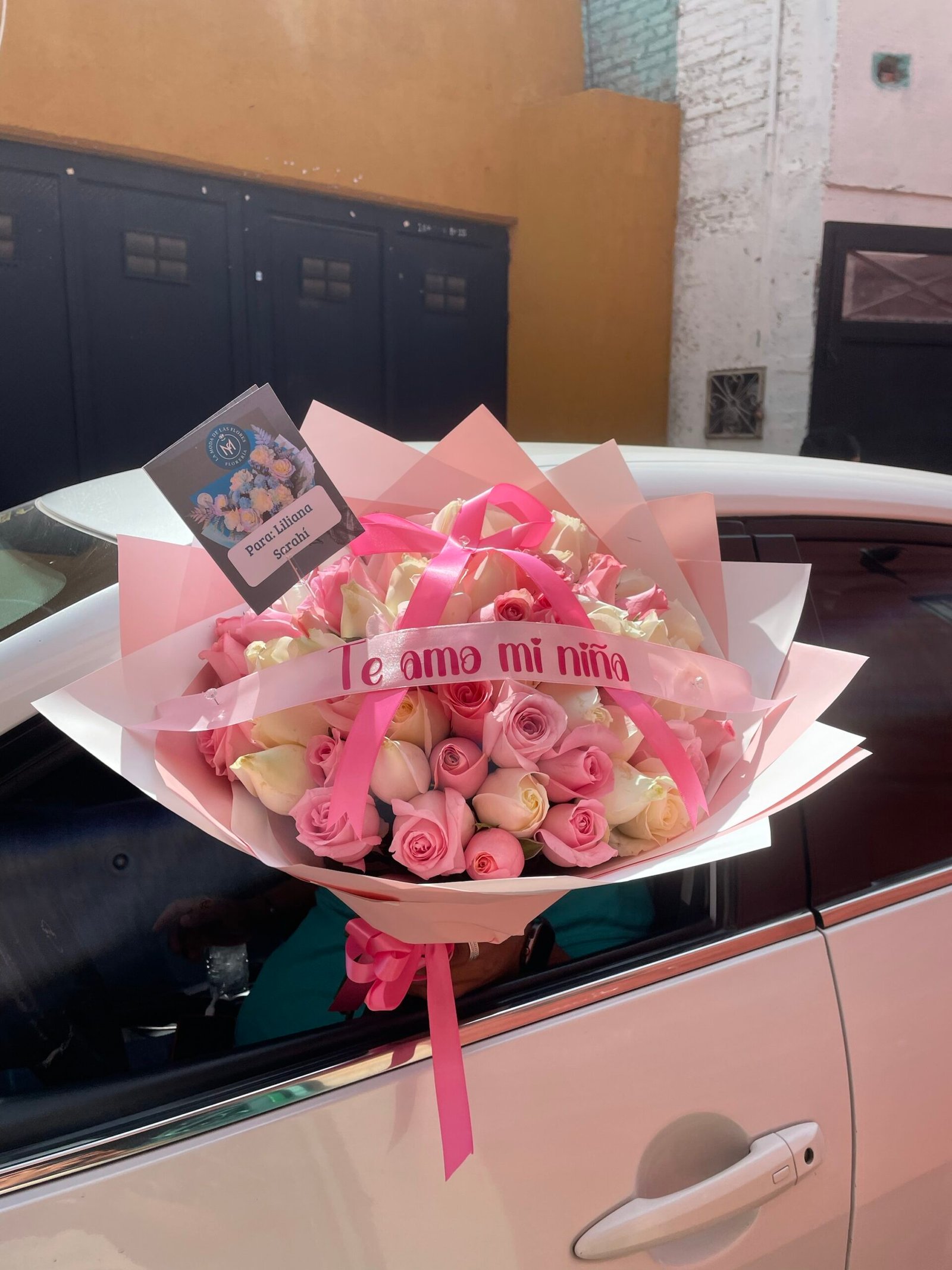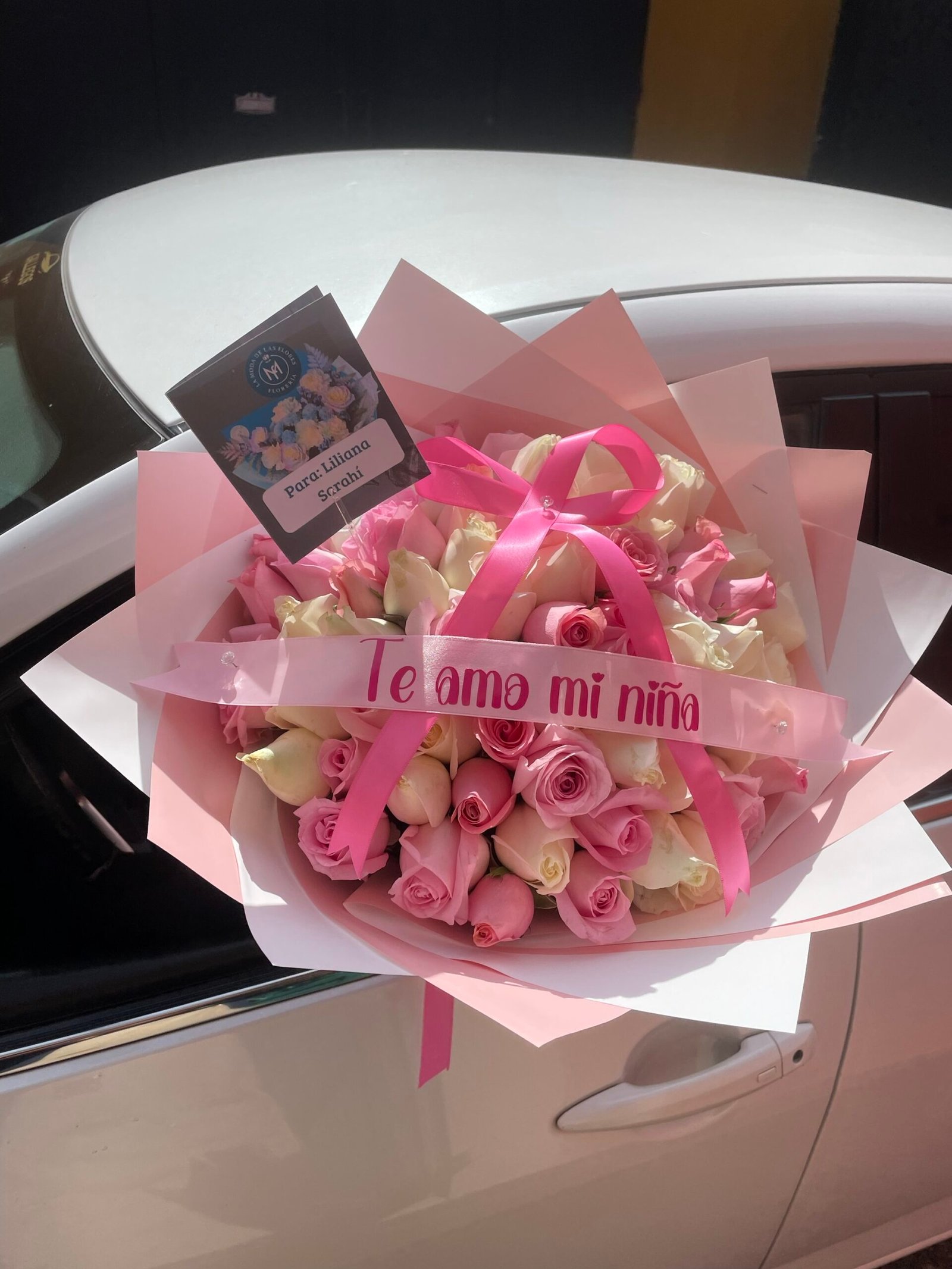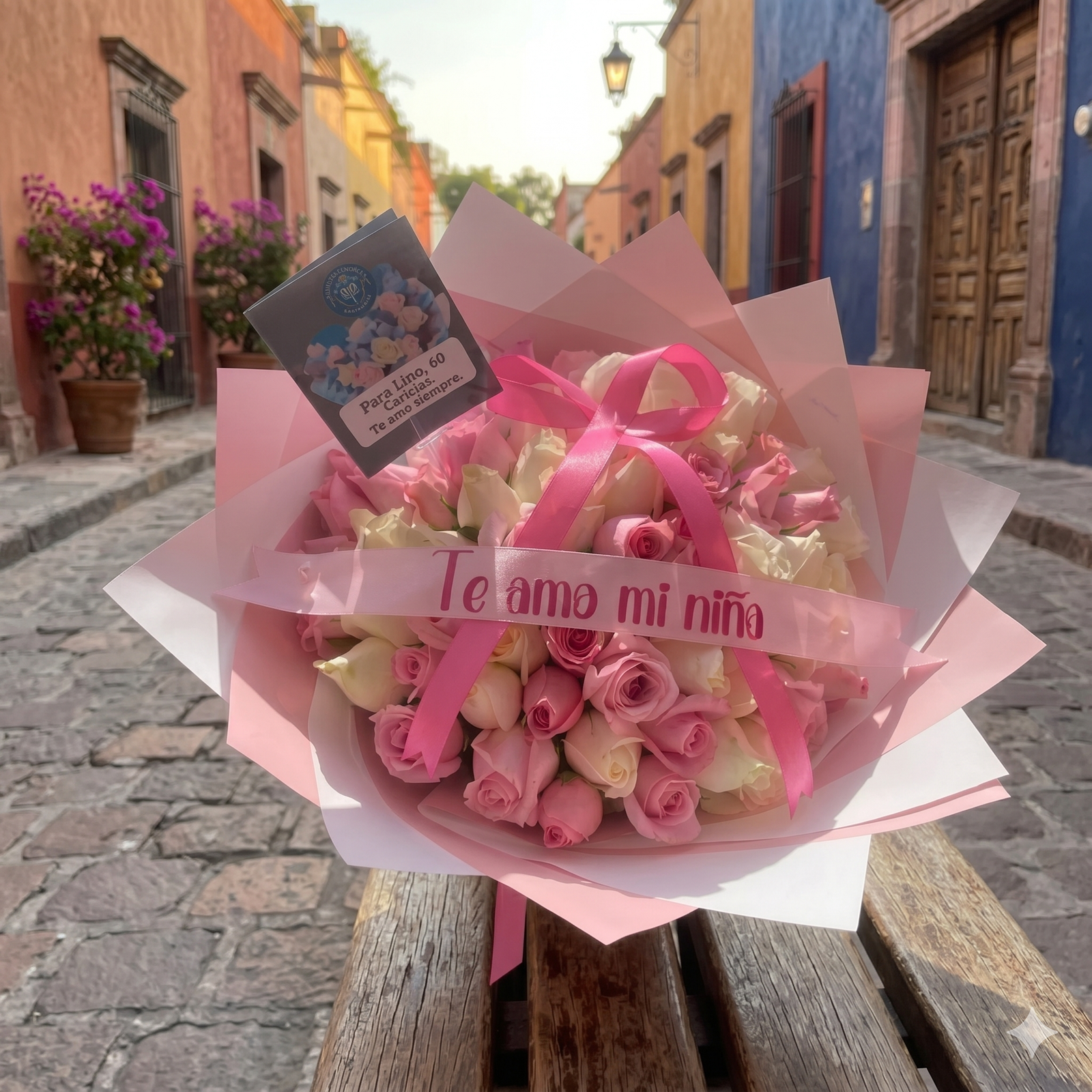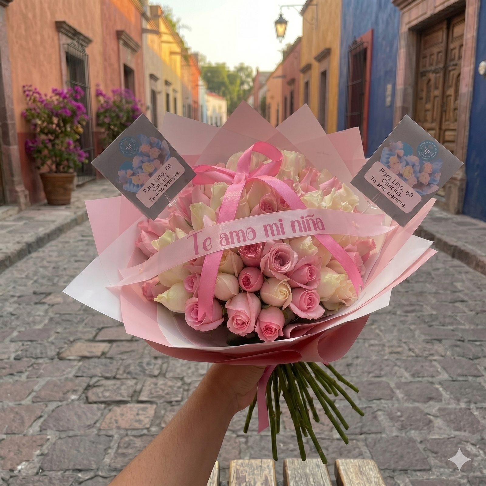Un diseño que transmite pureza y ternura, combinando 60 rosas en tonos blanco y rosita caricia. La disposición de las flores crea una armonía visual delicada, ideal para expresar sentimientos sinceros. El ramo incluye un listón personalizado para añadir un mensaje especial, con la flexibilidad de que el cliente puede elegir el color de las rosas según su preferencia. Se presenta con una envoltura moderna en papel coreano y un moño que complementa su estética limpia.